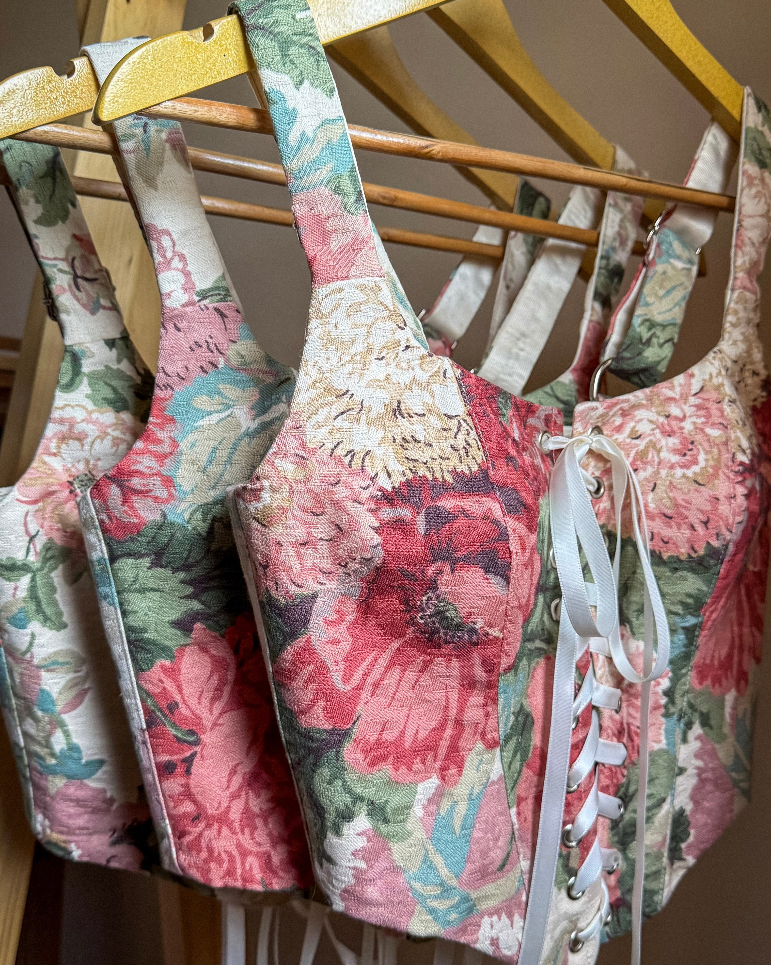 Una gran cantidad de los corsets están confeccionados con retazos o sobrantes de tapicería y telas únicas que solo se encuentran una vez.