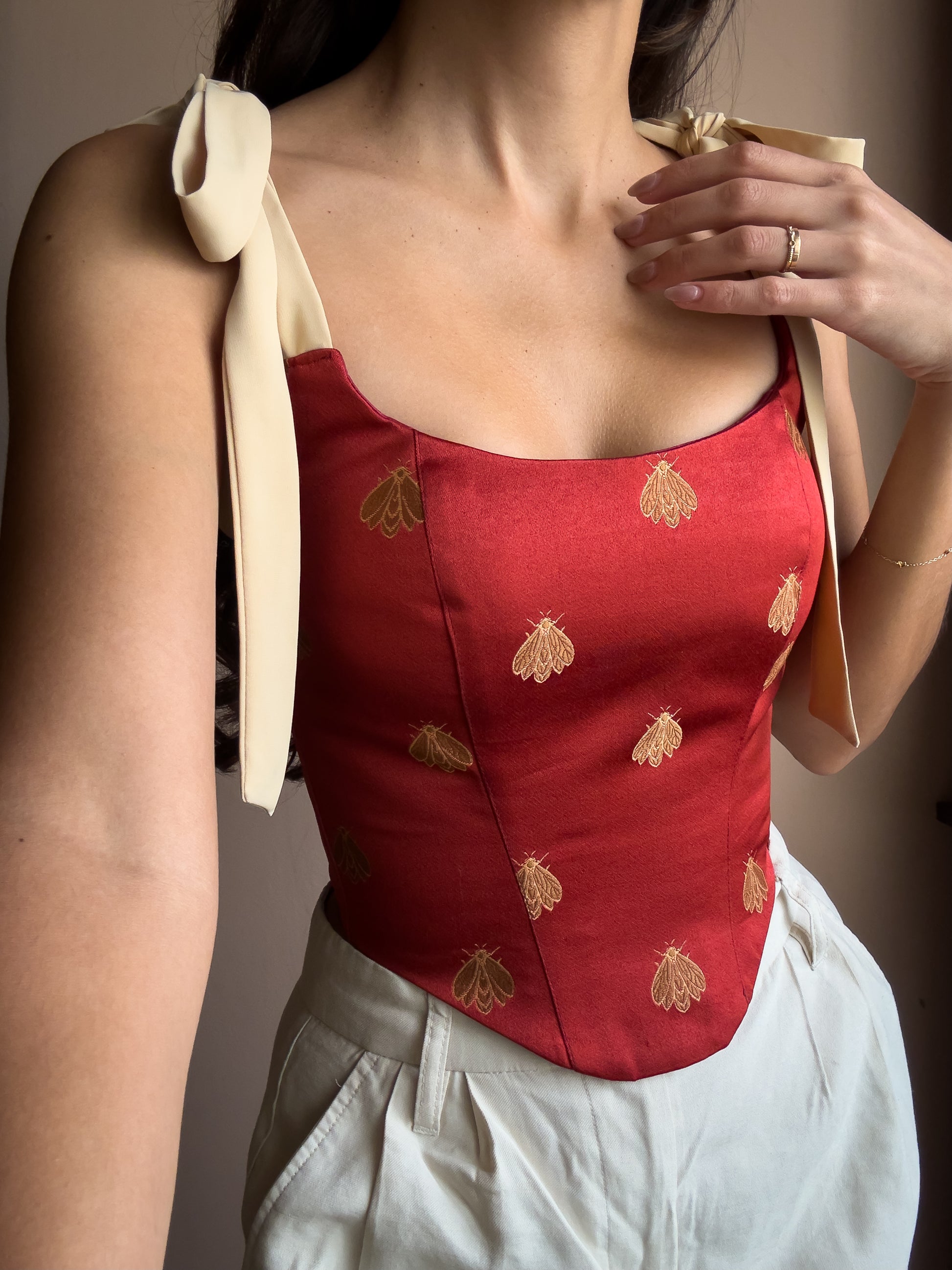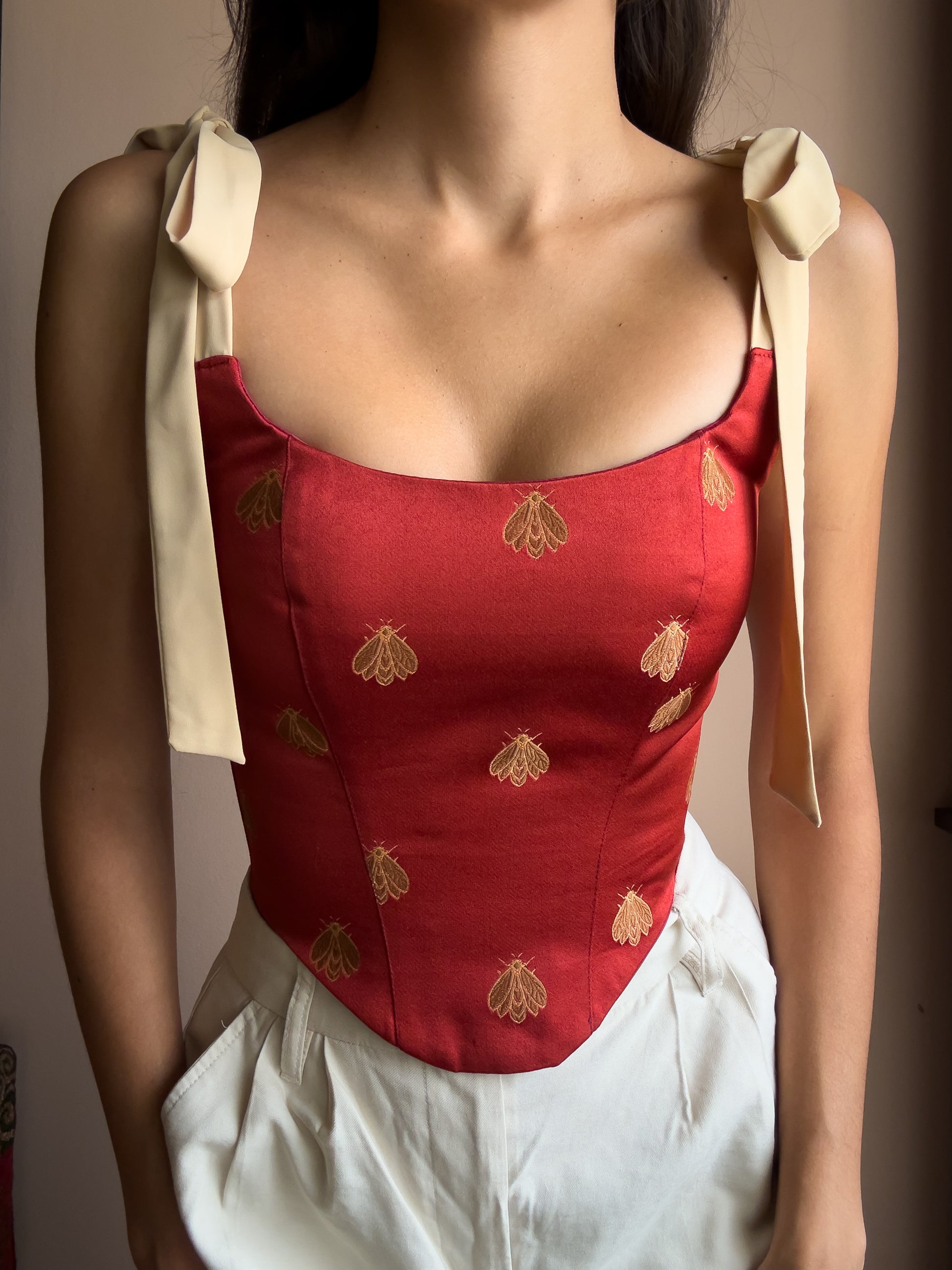 Lo más bonito de Georgia son sus tiros de seda que te permiten amarrarlos como tu creatividad te lo permita. Puedes hacer moños en la parte de adelante, en la parte de atrás, dejar los tiros caídos o amarrarlos encima de los hombros.